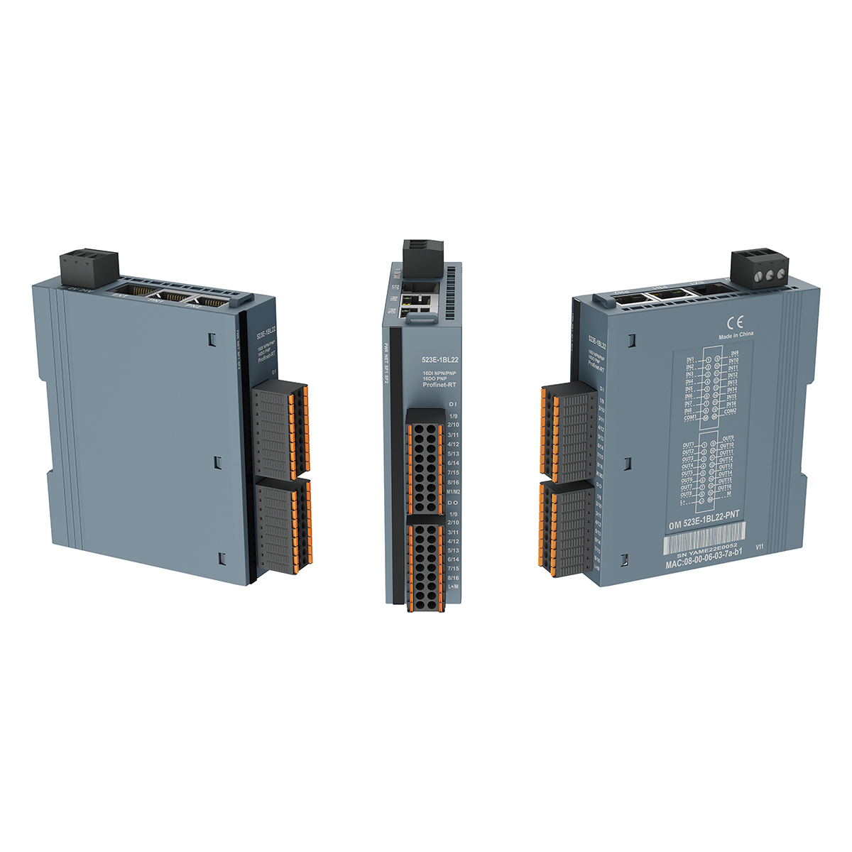 OM523E vertical internal bus distributed scalable coupler, Profinet-RT bus, 3 RJ45 ports, WellAUBUS backplane bus (black RJ45 port cable cascade, Category 5e cable module length limit of 20 meters, extension cable total limit of 150 meters), expandable to 16 modules, 24VDC power supply, with reset dial switch, the main body has 16DI (common cathode/common anode input), 16DO (PNP output), IP20 protection level,   DN35 rail installation